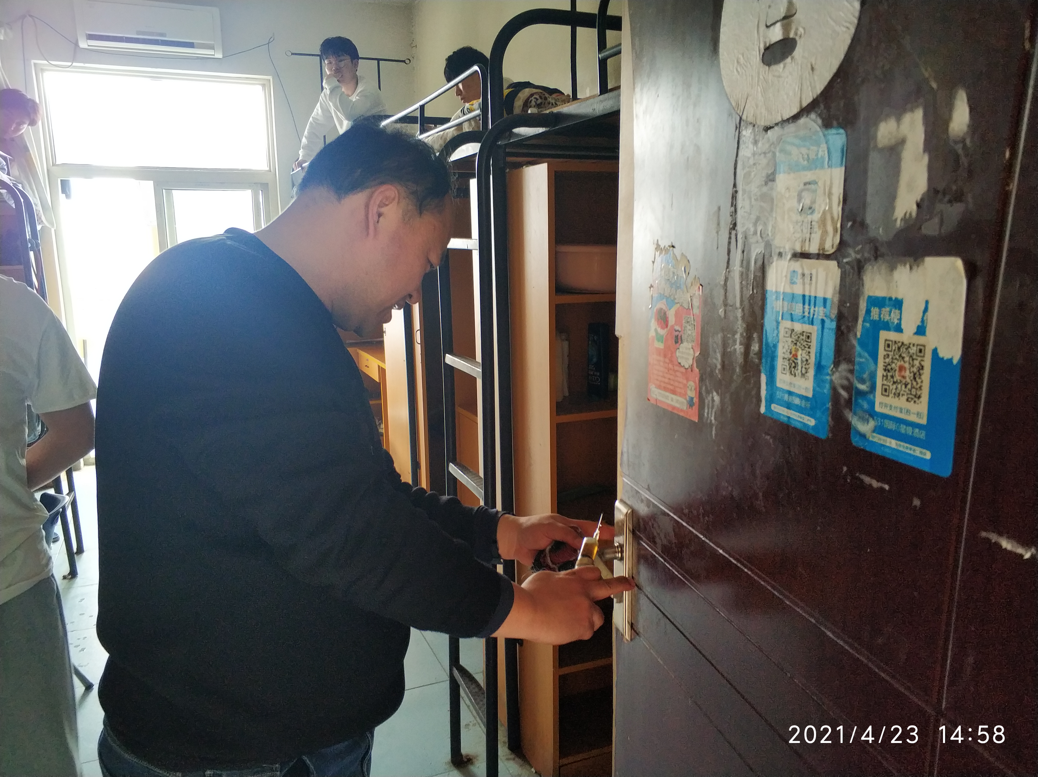 为深入开展党史学习教育活动,做好实践转化,围绕共建和谐校园,切实解决学生关心的实际问题,密切师生之间的关系,信电学院党支部经过到宿舍走访,了解到学生宿舍的空调从安装后已有多年没有进行过滤网清洗,夏季即将来临,为提高空调的使用效果,信电学院党支部利用教师党员机电专业的特长,于4月23日下午组织党员深入学生宿舍开展志愿者活动,为楚河校区信电学院25间学生学生宿舍进行空调维护、清洗滤网、维修门锁等为学生办实事活动,老师为学生服务,受到了学生的欢迎。