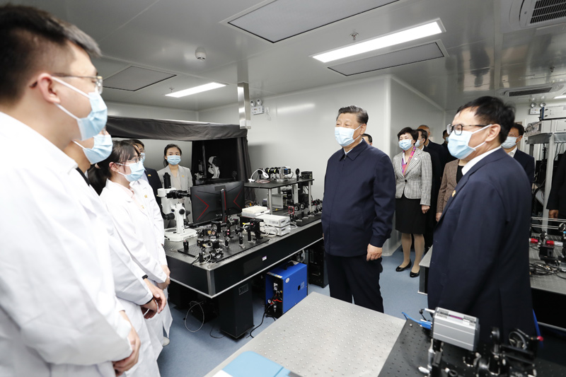 4月19日,在清华大学建校110周年校庆日即将来临之际,中共中央总书记、国家主席、中央军委主席习近平来到清华大学考察。这是习近平在清华大学成像与智能技术实验室同师生们亲切交谈。新华社记者 黄敬文 摄