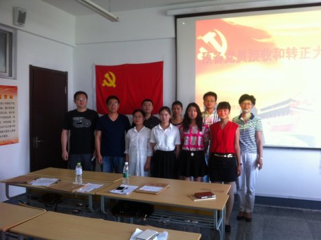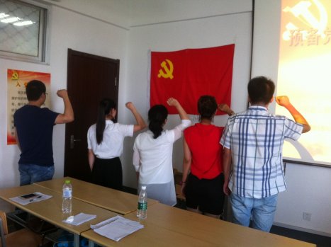 然后举行新党员入党宣誓仪式。马军老师作为领誓人,四位新党员站在鲜红的党旗下发出了誓为共产主义奋斗终身的誓言,表达了为共产主义事业奋斗终生的决心。