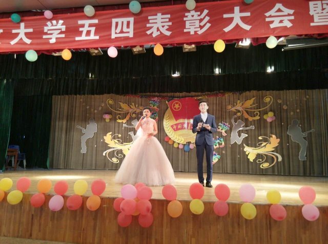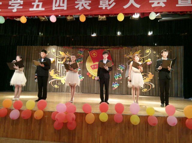 5月4日下午在高职校区大学生活动中心举办的五四表彰大会暨文艺汇演中,电信学院组织多名学生积极参与。