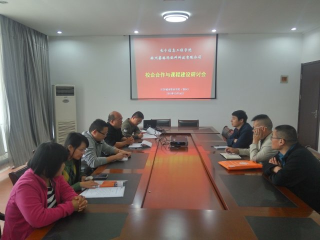 会上,首先学院高院长介绍电子信息工程学院的基本情况和相关专业建设情况,以及学院近几年实施的学生“实习-毕业设计-就业一体化”人才培养模式、“工学结合、课岗对接”的重点课程建设进行了说明。希望通过校企合作不断拓宽合作领域,实现优势互补,资源共享;更好地促进专业建设与教学改革,增强职业教育为地方经济社会服务的能力。徐州赛格玛科技有限公司主任马志刚、软件技术部陈主任,针对专业课程建设与课程开发以及企业对专业人才需求提出了指导性意见和建议,计算机教研室主任马军老师和相关老师也就专业课程课程教学、学生现状和学生能力培养等方面和企业技术人员进行了研讨交流。