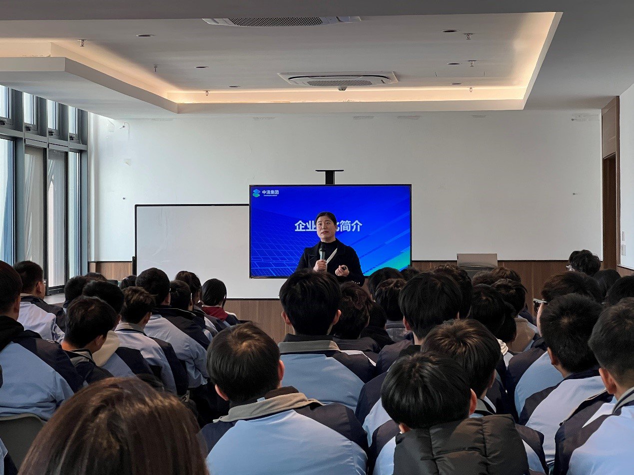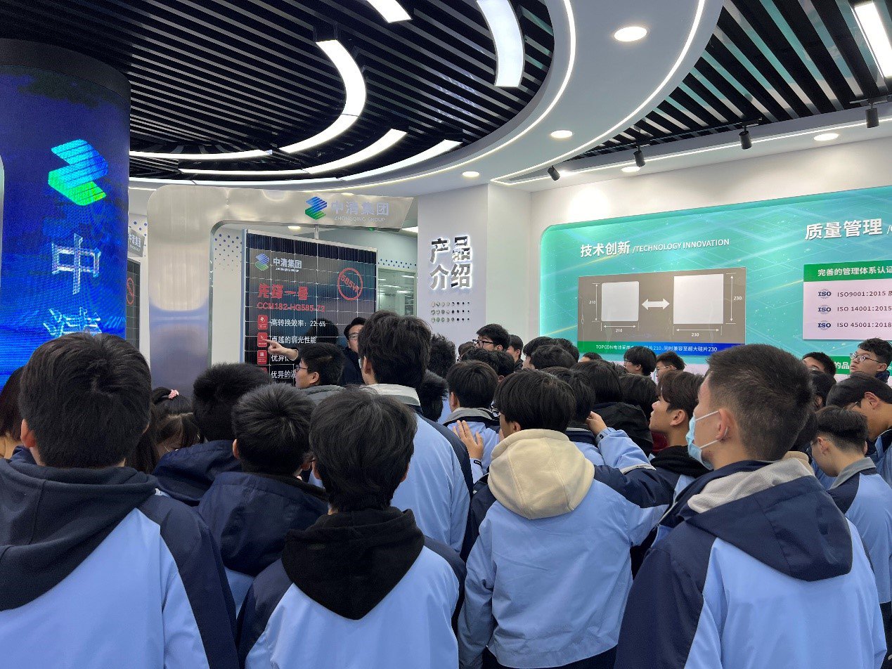 中清光伏科技有限公司对来访师生表示热烈欢迎,公司人力资源中心主管陈贝贝详细介绍了企业的发展历程、整体概况、企业文化、未来发展趋势、员工待遇及用人要求,并组织大家参观了企业车间、电池展厅及公司整个环境。