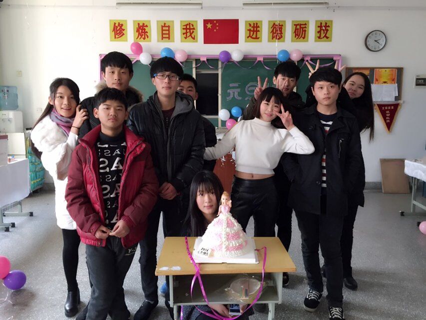 同学们在芭比蛋糕前合影
