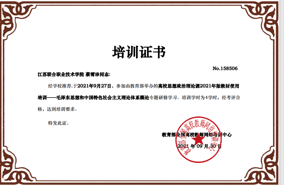 本次培训采用线上培训形式,分为毛泽东思想和中国特色社会主义理论体系概论专题和思想道德与法制专题进行研修学习。培训学时为每个专题4学时,经考评合格,五位老师均达到培训要求,颁发培训证书。