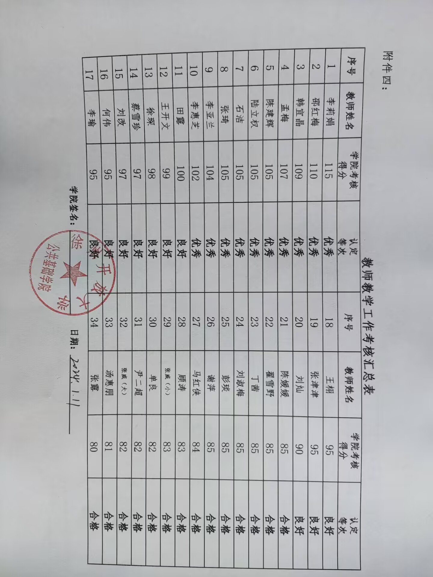 经我院教学质量考核领导小组核定,教学质量考核等次获得情况如下: