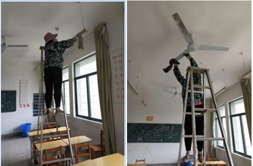 因风扇位置较高,学生清理存在危险,后勤管理处安排维修师傅将教学楼全部共70间教室的风扇和日光灯进行全面的清理,同时进行了维护。由于平时学生在教室上课,因此只能利用学生上实训课和课余的时间进行清理,在限期内完成风扇和日光灯的维护和清理。