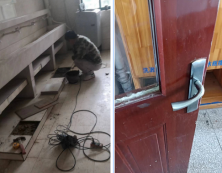 宿舍楼墙砖和地砖损坏的较多,墙砖脱落带来的安全隐患较大,后勤管理处安排专业维修师傅限期更换瓷砖。因宿舍房门材质问题,维修较困难,同维修师傅多次研讨,选择较为合适的办法对房门和门把手进行了维修更换。