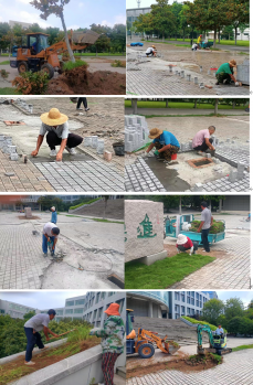 广场上的绿化带易积水走路不方便,经领导研究决定进行改造,移栽几颗树木,绿化带改造成统一的方砖,增加下水管道和下水口,解决雨后积水问题。