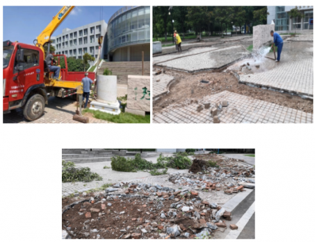 (三)为改善报告厅南“进德励技”广场雨后积水情况,邀请设计师整体设计后实施改造,增加预埋下水管道,校训石旁增设花钵。移除报告厅北广场石楠球十余棵,树穴用小砖填补、做造型,与满园绿地形成互补,两广场改造修补后,视野开阔,整体效果良好。