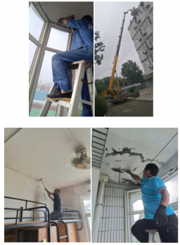 宿舍五层阳台顶部琉璃瓦破损老化,随时有掉落伤人的风险,制定可行方案,排查清除已风化可能掉落的琉璃瓦,并对其基底加水泥砂浆保护、做防水处理;排查更换部分宿舍破损的阳台窗户,加固窗框。
