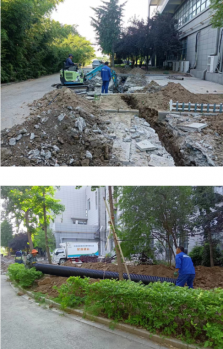 食堂南侧的位置下雨时经常积水,经过排查,由于地势较低暴雨时山上积水涌入,并且旧管道被油污凝固堵死,经过领导及施工方的研究讨论,决定更换为更大口径的排水管,需要把原管道挖出更换,并增加污水井,整体施工量大,施工难度高;另外食堂西南角由于食堂的施工改造造成地势较低积水无法排出,研究决定整体抬高,并设置排水口,彻底解决食堂周边雨天积水严重的问题。