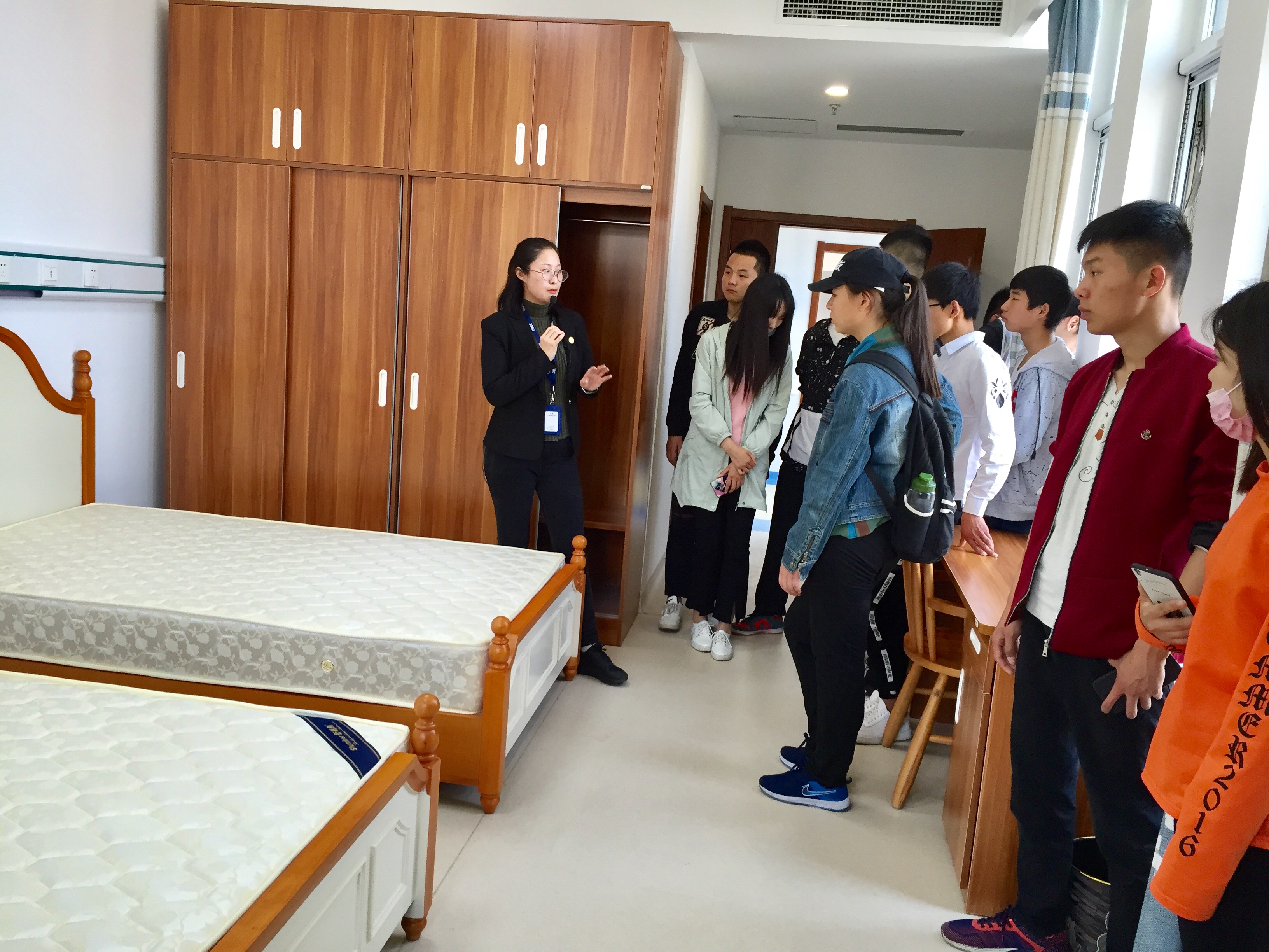 随后,同学们来到了九如城康复医院,参观了康复室、神经电生理治疗室等地方,了解康复器材的功能与使用方法。在病房,同学们向工作人员详细了解老人们常见病的治疗与护理工作。病区负责人还展示了老人日常护理技能等,同学们均表现出极大的兴趣。