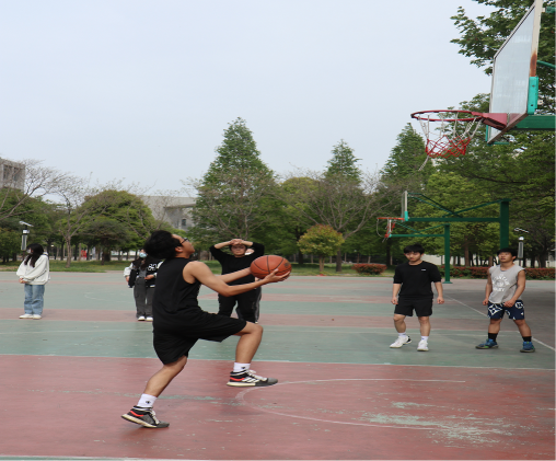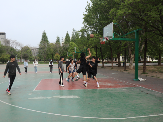 篮球场上,同学们个个斗志昂扬、精神饱满,随着一声哨响,裁判员将篮球高高抛起,一场别开生面的篮球赛开始了,发球、运球、传球、断球、拼抢……双方运动员个个生龙活虎,展开了激烈的争夺,气氛立刻活跃起来。值班教师乔清照、井立沛也应邀加入了球队,随着两位老师的入场,赛场的气氛更是达到了高潮,来自啦啦队的加油呐喊声此起彼伏。