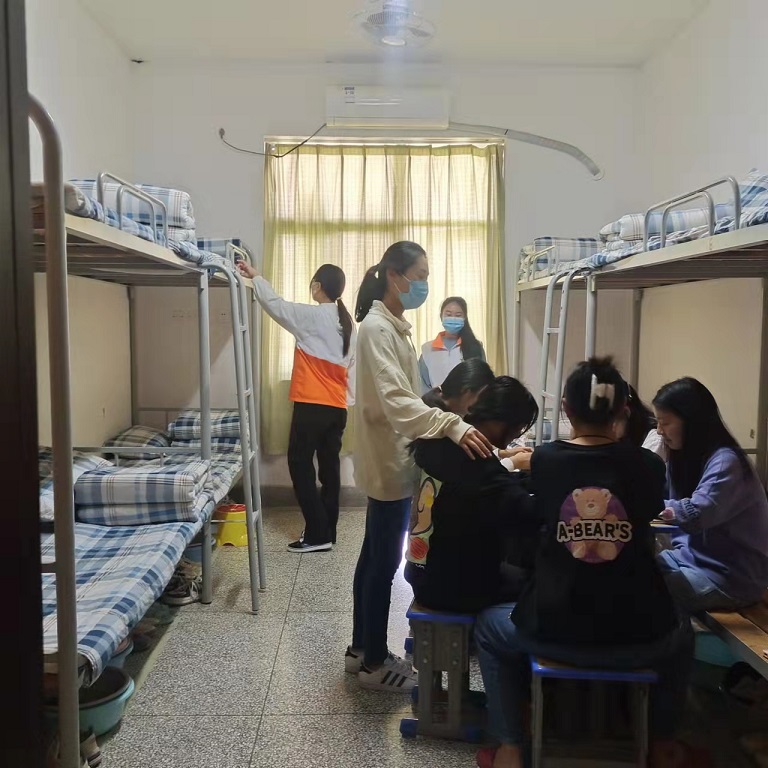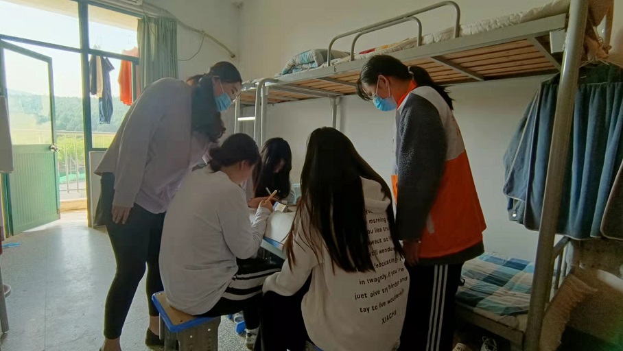 从4月19日起,抗“疫”志愿者先锋队开始轮流上岗工作,他们负责每日早上、中午两次配合值班老师进行宿舍巡查,督促学生上好网课,组织好学生日常的核酸检测,做好生活提醒,防止学生感冒、发烧,点名、核对每日在校人数。