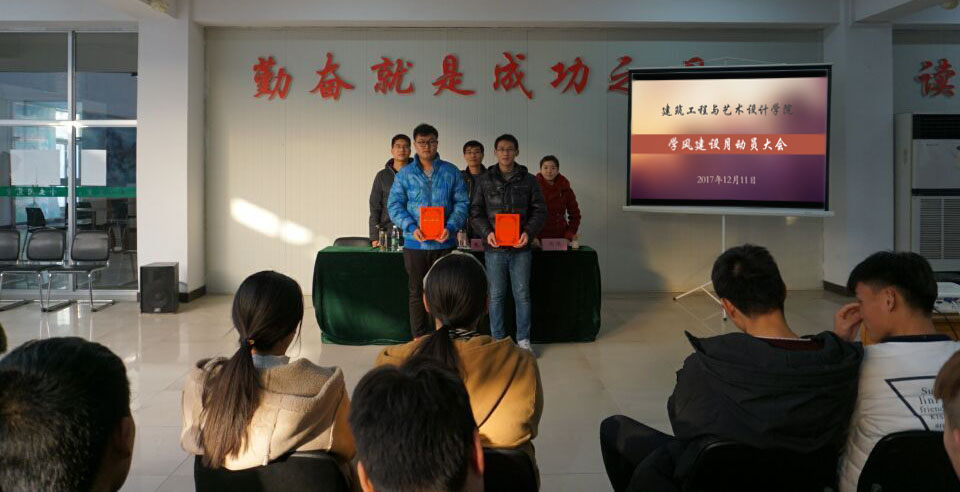 大会首先由学院党支部委员陶琛宣读了表彰决定,表彰了在2017年徐州市职业球友会(中国)官方网站技能大赛中荣获三等奖的刘汉猛同学,代表省校参加全省高校职业规划大寒荣获三等奖的李雪琦同学,以及在刚刚结束的第五届全国高等院校建筑软件技能认证大赛BIM5D软件认证网络大赛中获奖的团队和个人,并且对最近评出的“优良学风宿舍”、“文明宿舍”等集休及个人进行了表彭并现场颁奖。学生代表17级工程造价班宋光宇作为学生代表发言,倡导同学们从自身做起,明确学习目标,端正学习态度,规范学习行为,养成良好的学习习惯。