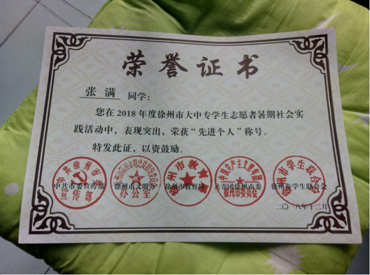2019年4月25日,我院小水滴志愿者服务队在2018年度徐州市大中专学生志愿者暑期社会实践活动中,表现突出,荣获“优秀团队”称号。小水滴志愿者张满同学荣获“先进个人”称号。