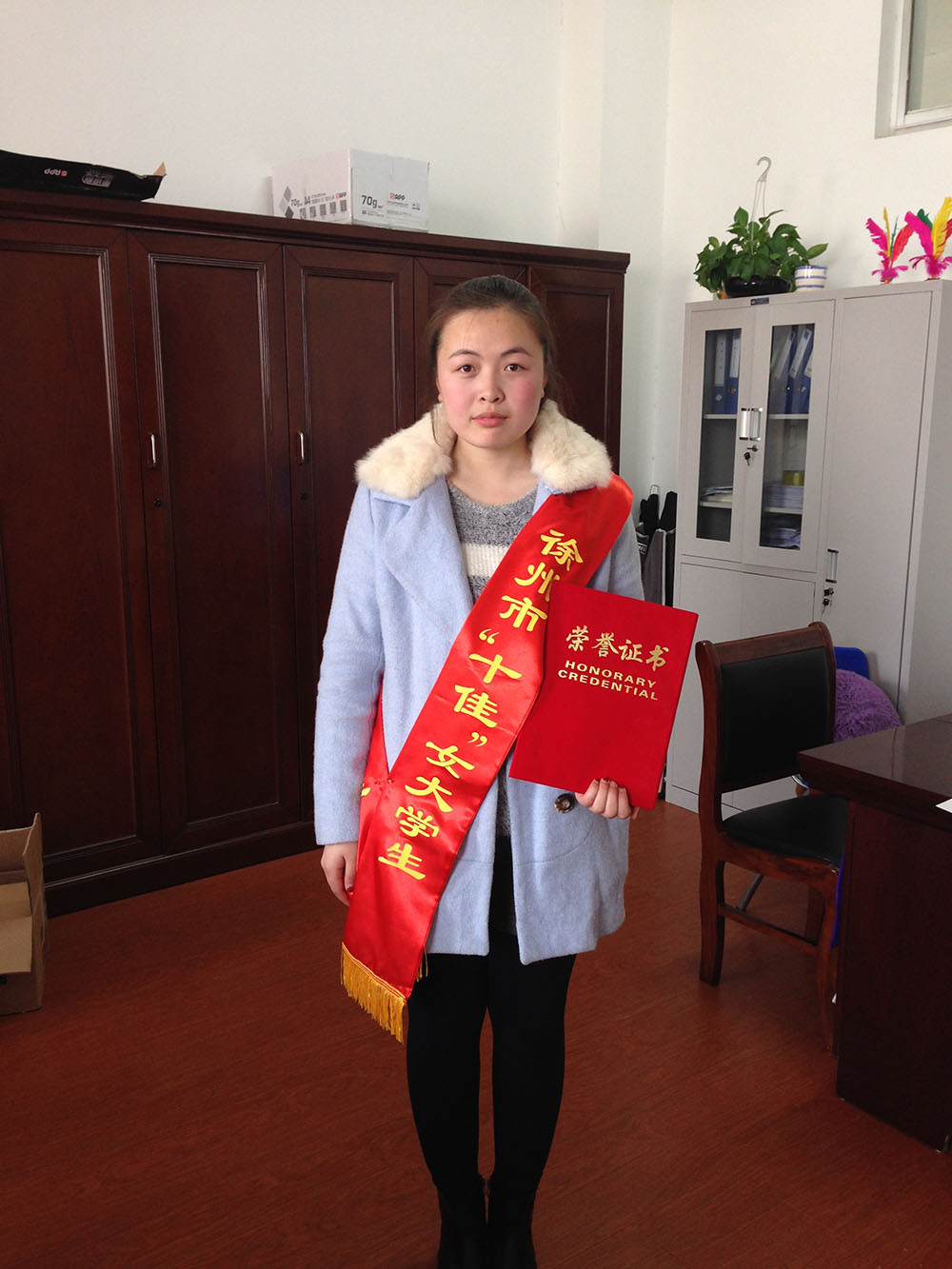 大会对第六届徐州市“十佳女大学生”进行了表彰。我校建筑工程与艺术设计学院装潢艺术设计专业柳晨晨同学获得第六届徐州市“十佳女大学生”荣誉称号。