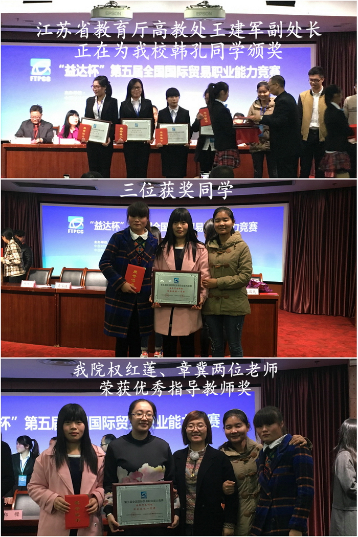 第五届全国国际贸易职业能力竞赛于2015年11月23日在南京圆满闭幕,我院13物流管理班韩孔、蔡伟霞、刘文杰三位同学代表球友会(中国)官方网站参赛取得优异成绩,总决赛时从全国58个代表队中脱颖而出,荣获进出口单项技能一等奖和综合技能一等奖,我院权红莲、章冀两位老师获优秀指导教师奖。