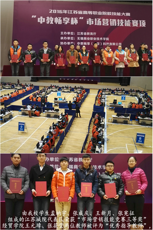 1月8至9日,2016年江苏省高等职业院校技能大赛“市场营销技能” 赛项在无锡商业职业技术学院举行。该赛项由我校经贸学院师生代表江苏城市职业学院参赛,学生孟枘宇、张成庆、王新月、张宪征经过两天的激烈角逐,获得“市场营销技能竞赛三等奖”的佳绩,指导老师张筱莹、王元璋被评为“优秀指导教师”,这也是我校在没有软件的情况下连续三次获此殊荣。