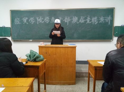 2016年11月22日18:30,迎着2016年的第一场雪,经贸学院在教学楼406教室举行了学生干部换届竞聘演讲大会,本次换届大会由现任团总支书记蒋娅歆主持召开,出席本次大会的有经贸学院鲍书记和学生会主席团代表以及所有学生会成员和参加竞选的同学。