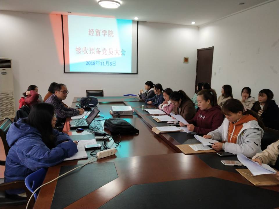 11月8日下午,经贸学院党支部在多媒体212室隆重召开预备党员接收大会,该会由经贸学院党支部书记许正义同志主持,参加人员支部全体党员同志、5名发展对象、13名入党积极分子及辅导员。