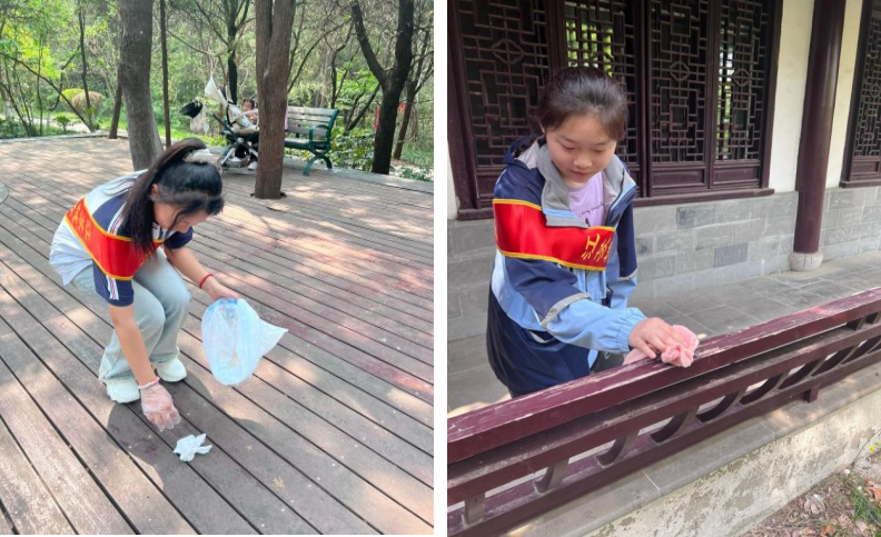 到达公园后,志愿者们迅速分组,开始了更为细致和专注的清理工作。一组志愿者负责清理花园中的杂物,另一组志愿者则专注于整理公园的路面及设施。清扫落叶、清理垃圾、擦拭公共设施,摆放共享电动车,确保公园的每个角落都焕然一新。