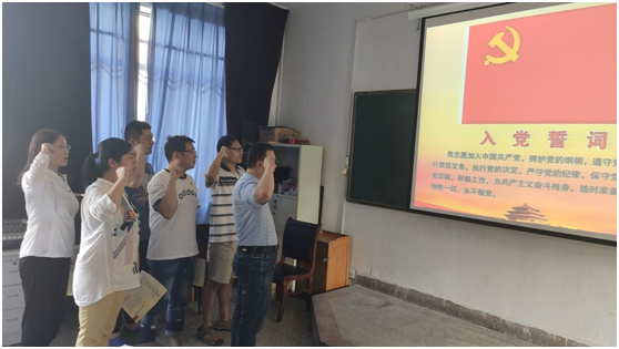 党支部书记李晓荣主持“政治生日”活动,党支部委员、院长邱息良代表党支部为每位党员送上政治生日贺卡并握手致贺。过政治生日党员面向党旗宣誓,重温入党誓词。李晓荣发表了简单短的讲话,对6位党员“政治生日”表示祝贺,希望大家进一步强化“四个意识”,坚定“四个自信”,做到“两个维护”,不忘入党初心,牢记历史使命,坚守工作岗位,进一步发挥党员先锋模范作用。