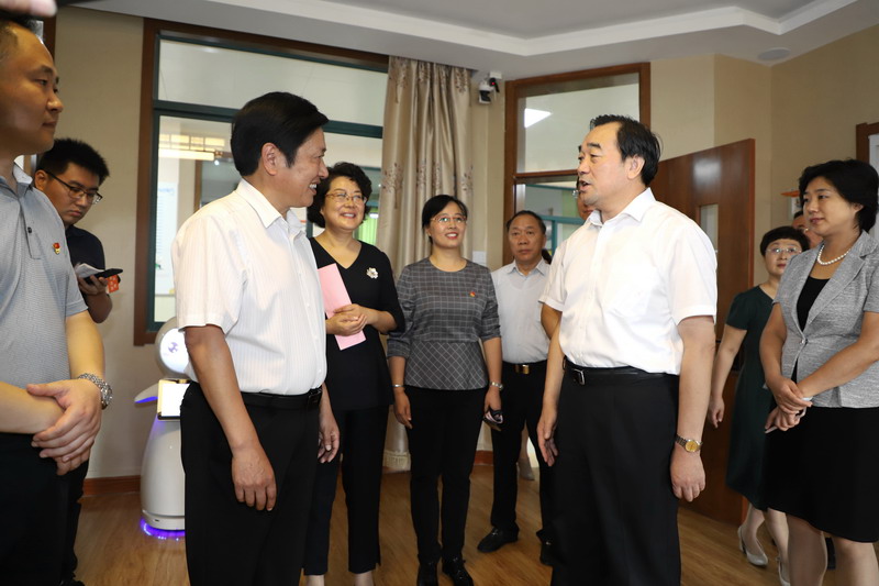 周铁根首先来到健康与养老教育学院,考察了淮海经济区健康养老实训中心,查看了在建的“徐州市社区公共服务职业体验中心”,他对徐州开放大学近年来事业发展所取得的成绩表示充分肯定。周铁根指出,徐州开放大学党委带领全校师生,认真贯彻党的教育方针,办学特色突出,各项事业发展成效显著,尤其是适应社会需要开办养老专业,培养紧缺型养老服务与管理人才,走出了一条有鲜明专业特色的生存发展之路,为徐州社会事业发展做出了贡献。