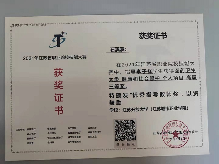 2021年江苏省职业院校技能大赛中,指导李子祥学生获得医药卫生大类 健康和社会照护 个人项目 高职三等奖,荣获“优秀指导教师”。