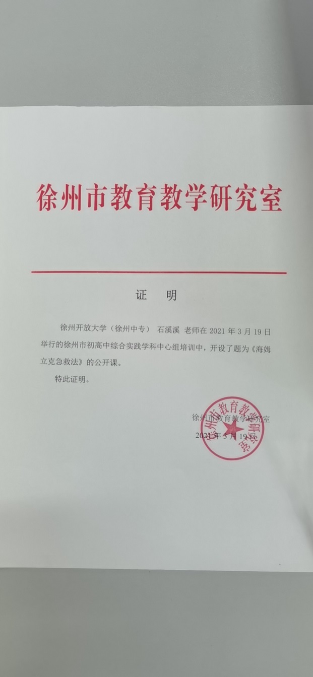 2021年3月19日,石溪溪老师在徐州市初高中综合实践学科中心组培训中顺利开设了题为《海姆利克急救法》的公共课。