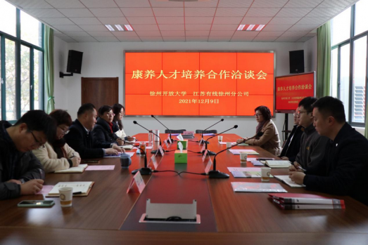 为进一步加强与主流媒体合作,探索构建康养与媒体合作新模式,12月9日,江苏有线徐州分公司党委书记、总经理邱强一行来校洽谈校企合作事宜,副校长胡钊涵出席活动。