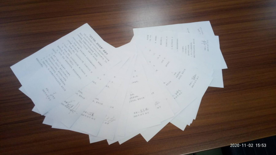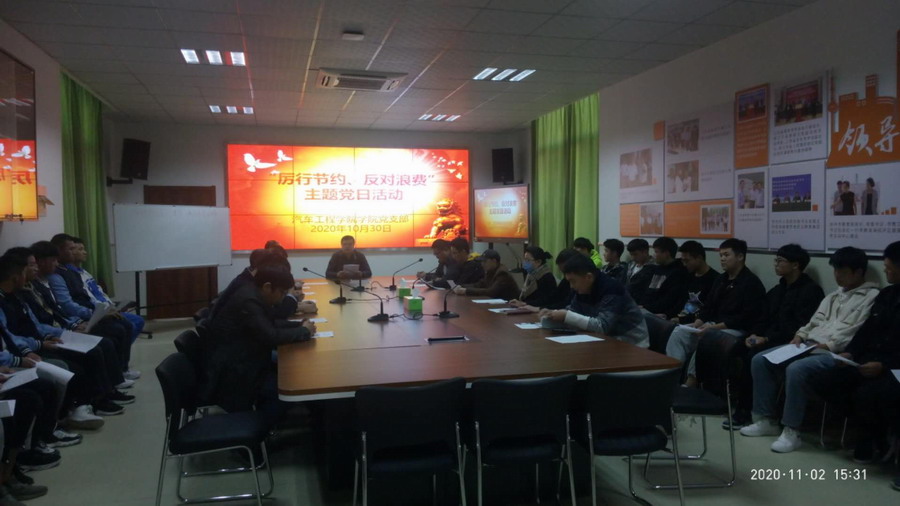 会议首先学习了习总书记关于“厉行节约、反对浪费”重要指示;接着观看了中央和国家机关带头制止餐饮浪费视频和“厉行节约、反对浪费”主题教育视频,集体签订了“厉行节约、反对浪费”承诺书;最后所有参会党员在“厉行节约、反对浪费”签名墙上进行集体签名。会后,各班班长回到班级进行宣讲,并代表全班同学慎重在“厉行节约、反对浪费”承诺书签字。