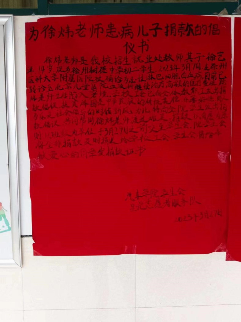 “徐炜老师是我校招生就业处教师,其子徐艺洋,14岁,现为徐州树德中学初二学生,2023年3月7日,在徐州医科大学附属医院被确诊为急性淋巴细胞白血病,目前已转诊至北京儿童医院血液科继续治疗,高额的医疗费使徐炜老师生活陷入窘境。”扶危济困是中华民族的传统美德,乐善好施、助人为乐更是社会倡导的时代新风。得知徐炜老师的困难后,我院全体师生都非常揪心,都希望徐艺洋能尽快战胜病魔,回归正常生活。得知球友会(中国)官方网站老师们在积极捐款的消息后,汽车工程学院学生会全体学生干部、星火志愿服务队全体队员也积极发出了捐款倡议,纷纷伸出援助之手,院学生会及星火志愿服务队共计51人,合计捐款1413元,善款通过工会转交给徐炜老师。