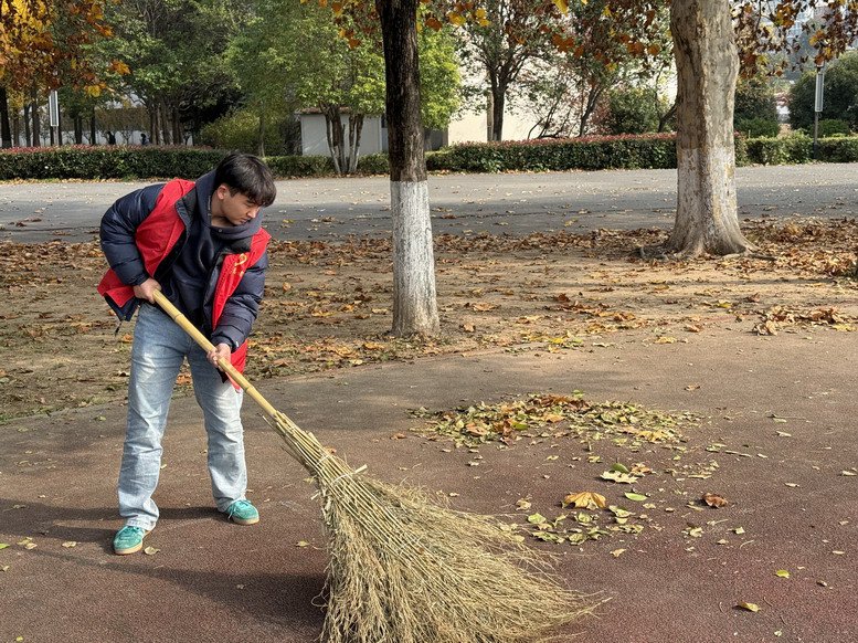 活动现场,志愿者们手持扫帚、簸箕、垃圾袋等工具,分工协作、默契配合。大家弯腰俯身,细致清理跑道旁的纸屑、饮料瓶等垃圾,认真清扫操场内外大量枯黄落叶, 重点整治角落缝隙等卫生盲区。凛冽寒风中,志愿者们干劲十足,忙碌的身影构成了校园里一道靓丽的风景线。经过近两小时的集中清扫,操场路面洁净如新,整体环境焕然一新。