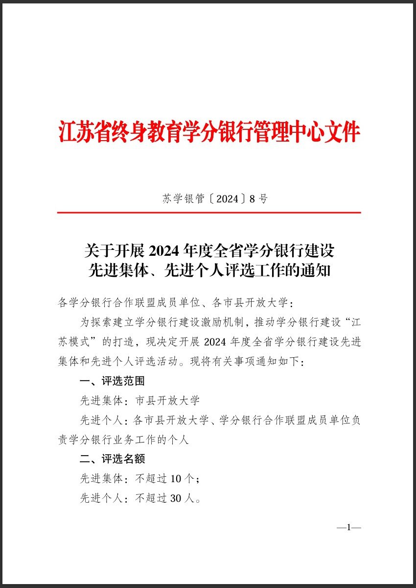 关于开展2024年度全省学分银行建设先进集体、先进个人评选工作的通知