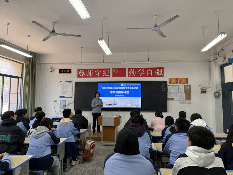 2025319日下午,在第30世界结核病日来临前夕徐州市传染病医院(徐州市第七人民医院)结核三科科主任刘慧梅主任医师一行走进我校为我校全体班级健康委员代表开展了一场别开生面的结核病防治健康宣教活动,并通过他们将结核防控的相关知识向全体同学普及。活动以医校携手健康行,共筑校园防痨网为主题,通过知识讲座、互动问答建等形式,为我校师生送去健康知识,助力打造无结核校园示范标杆。