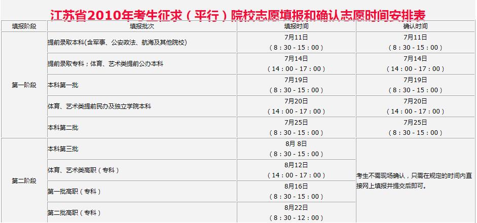 江苏省2010年考生征求(平行)院校志愿填报和确认志愿时间安排表