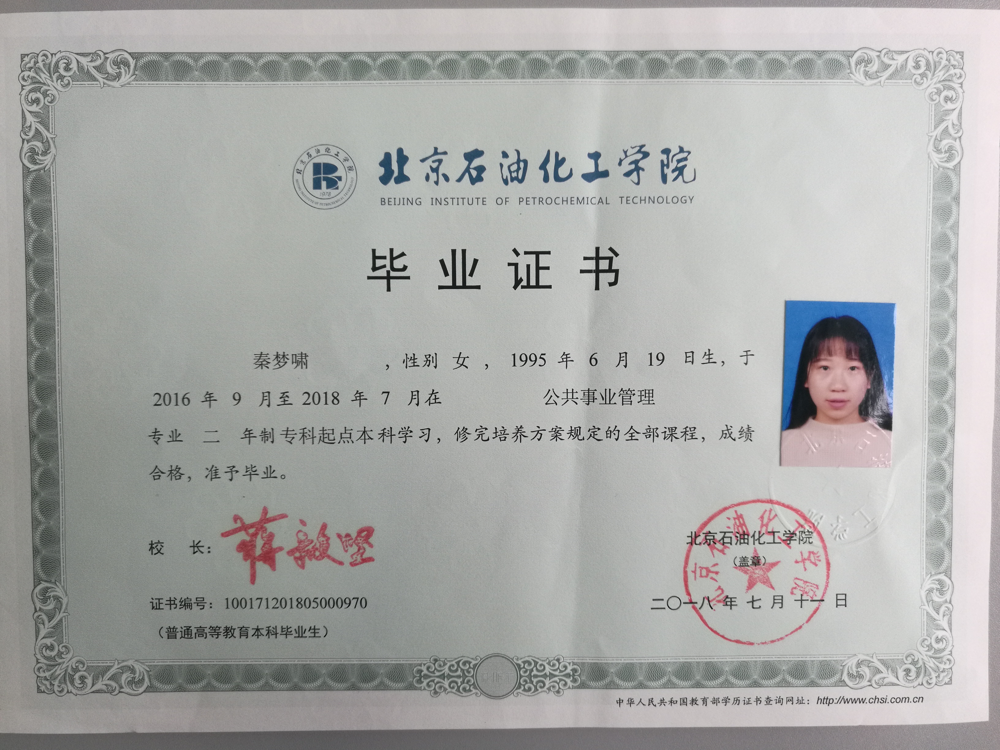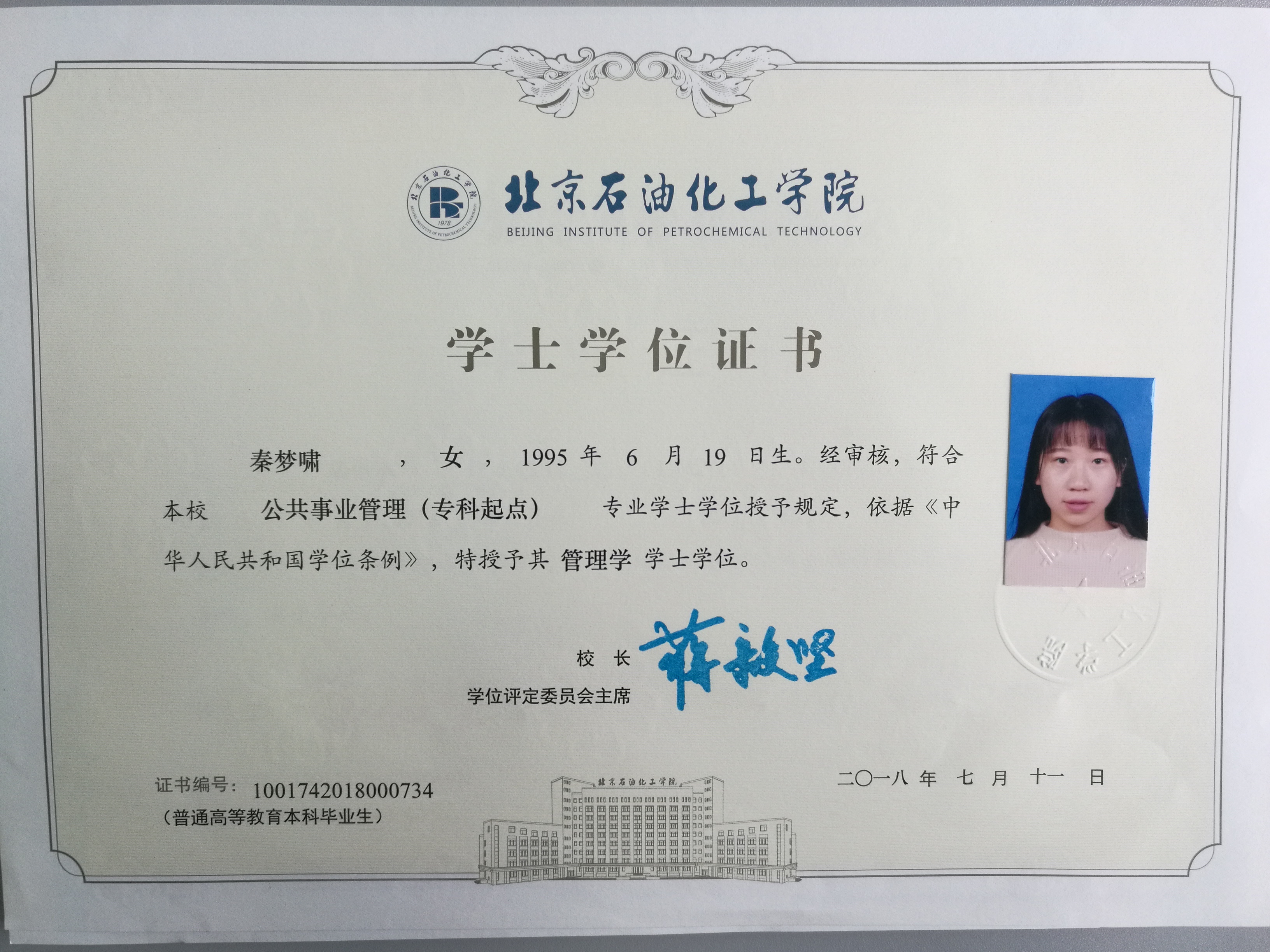 秦梦啸,女,24岁,中共党员,本科学历,2018年7月毕业于北京石油化工学院公共事业管理专业,获管理学学士学位,曾在2015年第六届全国养老护理员技能大赛中荣获一等奖并取得养老护理员中级证。