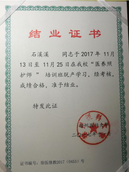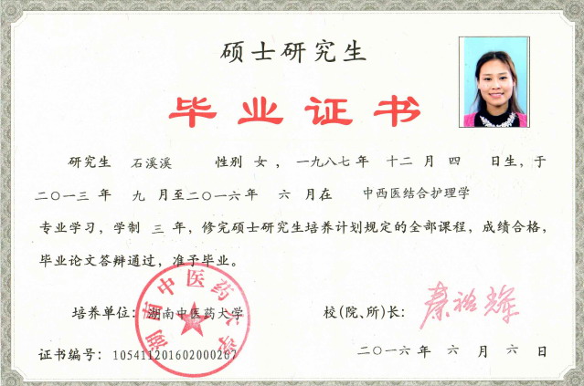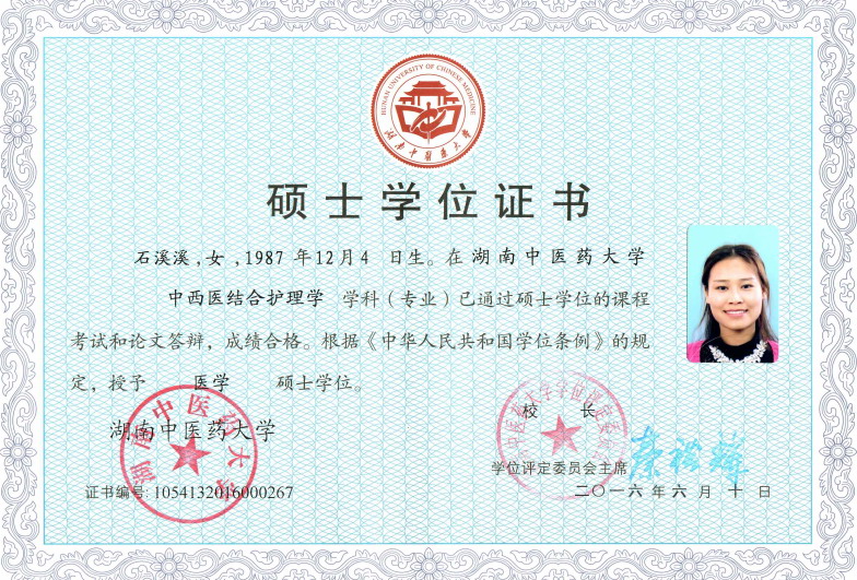 石溪溪,女,31岁,中共党员,毕业于湖南中医药大学,中西医结合护理学硕士,助教,护师,医养结合师,高级养老护理员,从事护理临床3年,曾任医院团委副书记,湖南省护理学会干事,兼职《当代护士》杂志编辑工作。主要学术方向为“护理教育、老年护理”。公开发表论文26篇,参与《中医特色护理技术与应用》、《中医健康管理规范》与《老年服务礼仪与实务》的编撰工作,参与课题13项,其中部级课题1项,省级课题7项,市级课题2项,获得国家级奖励2项,省级奖励8项,获国家授权专利2项。