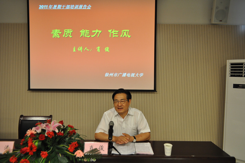 上午九点,原徐州工程学院党委书记肖俊作了题为《素质 能力 作风》的专题报告。