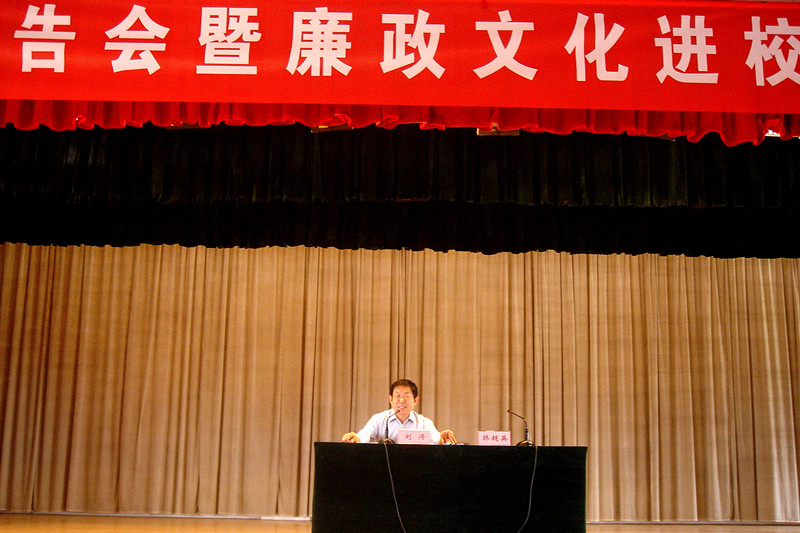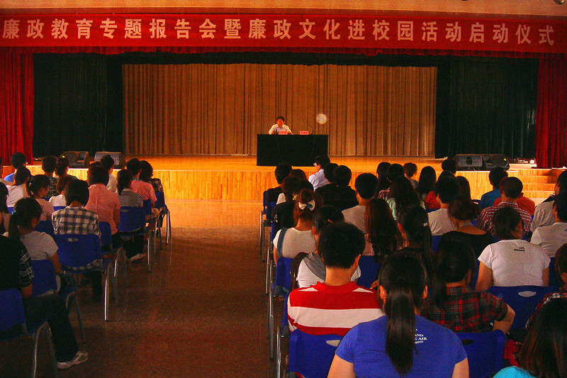 5月11日下午,我校在南校六楼大学生活动中心举行廉政教育专题报告会暨廉政文化进校园活动启动仪式。校党委书记刘涛作了题为“当代大学生与廉政文化”的专题报告。各系党支部书记、党办、学工处、团委等部门同志、班主任和全体学生干部、入党积极分子及学生代表共500余人聆听了报告。报告会由校党委副书记韩超英主持。