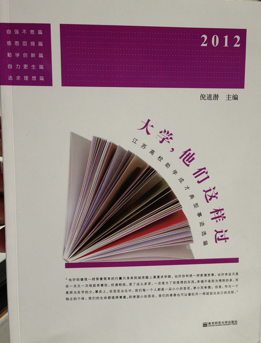 日前,我校向省教育厅推荐的沈秋艳同学自力更生的事迹,被省教育厅资助中心收集在《江苏高校助学成才典型事迹选编——大学,他们这样过》一书“自力更生篇”中。这是江苏城市职业学院办学系统唯一入选该书的一篇。