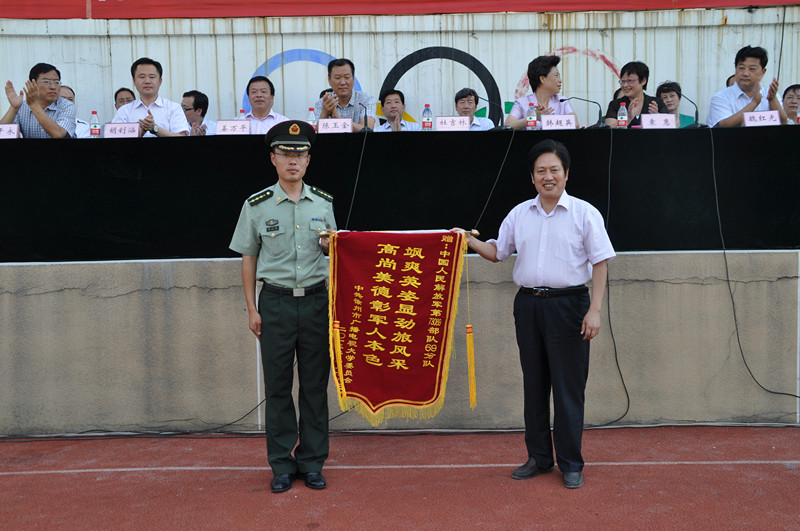 分列式结束后,党委书记杜吉林向承训部队赠送了锦旗。