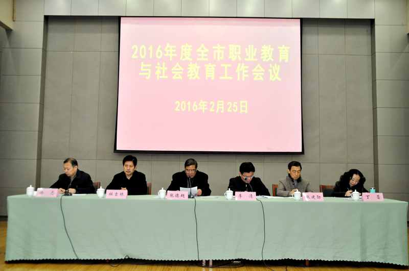 李清副局长作工作报告,他指出2016年是“十三五”开局之年,徐州市教育局将继续认真落实以服务为宗旨、以就业为导向的职业教育办学基本方针,牢固树立“产教融合、中高衔接、普职互通、双师双证、品牌特色”的徐州职业教育创新发展工作思路,树立苏北领先、江北第一、全省一流的奋斗目标,全力打造“学在徐州”职教品牌。
