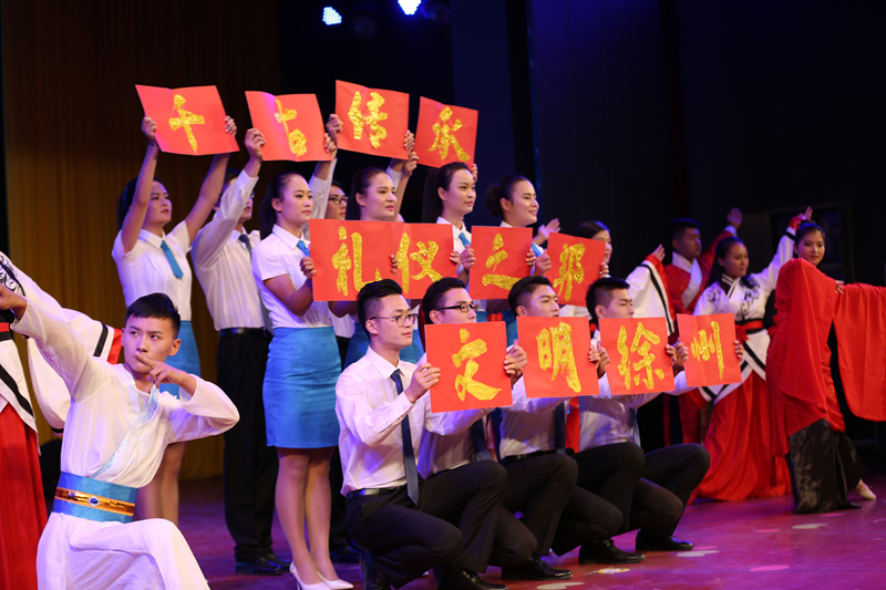 “文明徐州、礼仪之邦、千古传承。”在文明礼仪展示环节,徐州开放大学代表队的学生们身着汉服,以诗歌朗诵的形式展现悠久的汉文化。“时空穿梭”回到现代,学生们换回现代装,展现了实用礼仪动作,将站姿、坐姿、走姿、手姿等基本行为体姿和微笑、点头、注目、欠身、鞠躬、指示、握手、招手、递物、介绍、接听电话、迎送等礼姿相结合,灵活应用在风采展示中,彰显了彭城礼韵。