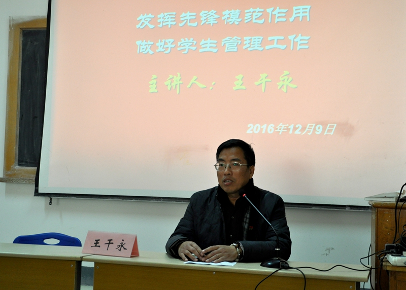 健康与养老教育学院党支部书记王干永同志以《发挥先锋模范作用做好学生管理工作》为题,要求全体学员树立正确的入党动机,努力做到思想上入党。在理想信念、思想觉悟和行动实践等方面达到党员标准,一言一行都要以党员的标准严格要求自己,充分发挥党员的先锋模范作用。