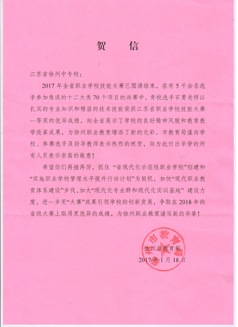 近日,徐州市教育局向我校发来贺信,祝贺我校石勇老师荣获江苏省职业球友会(中国)官方网站技能大赛一等奖。贺信中说:“在有五千余名选手参加角逐的十二大类70个项目的决赛中,贵校选手石勇老师以扎实的专业知识和精湛的技术技能荣获江苏省职业球友会(中国)官方网站技能大赛一等奖的优异成绩,向全省展示了球友会(中国)官方网站的良好精神风貌和教育教学改革陈果,为徐州职业教育增添了新的光彩!”