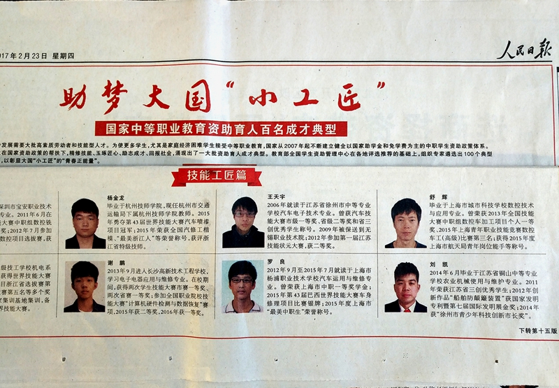 近日,国家中等职业教育资助育人百名成才典型评比揭晓,我校2009届汽车应用与维修专业优秀毕业生王天宇入选“技能工匠篇”。 223日,《人民日报》第1415版专题刊登了《助梦大国“小工匠”——国家中等职业教育资助育人百名成才典型》的报道。
